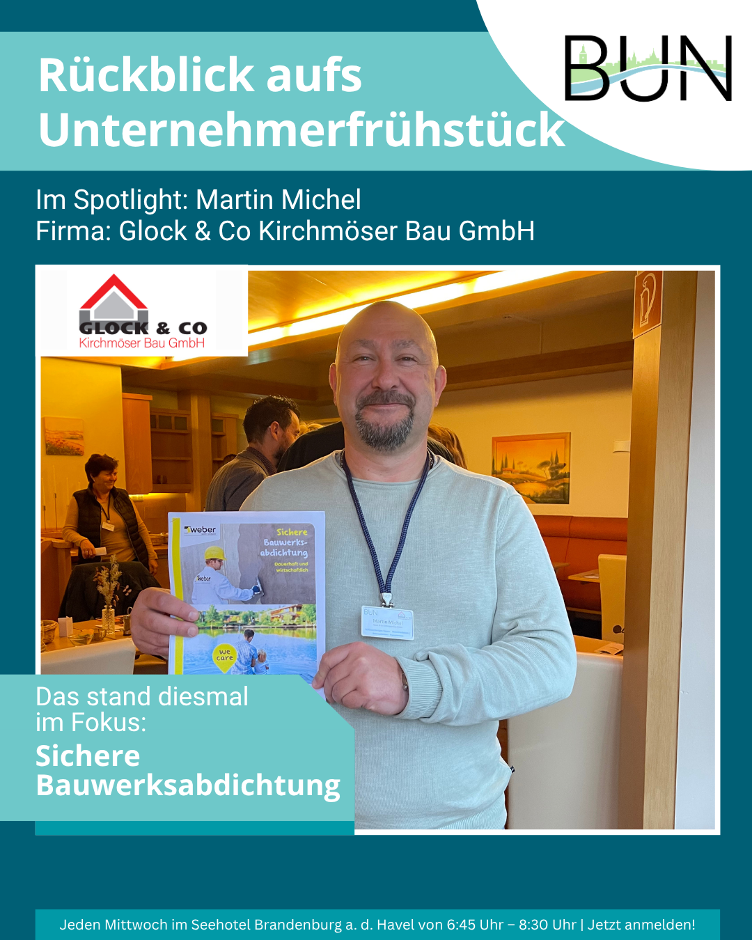 Beim letzten Treffen hat Martin von Glock & Co Kirchmöser Bau GmbH das Thema Bauwerksabdichtung im Mittelpunkt gestellt.Er machte deutlich, wie entscheidend eine fachgerechte Ausführung ist, um Feuchtigkeitsschäden, Folgekosten und strukturelle Probleme am Gebäude dauerhaft zu vermeiden.Mit Verweis auf die Abdichtungsfibel der Firma Weber erklärte er:Schon kleine Ausführungsfehler können später