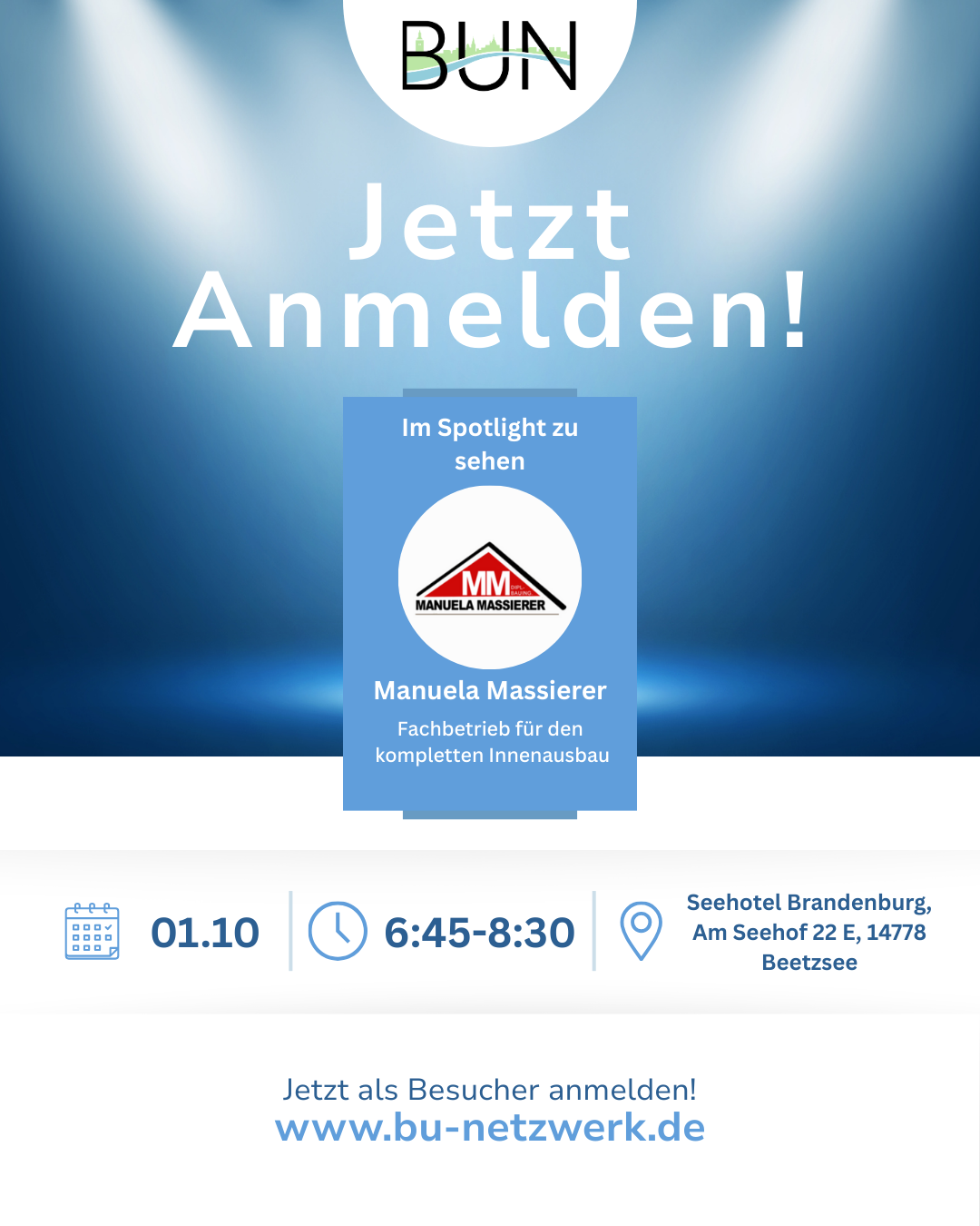 Beim nächsten Treffen des »Brandenburger Unternehmer Netzwerks« (BUN) steht Manuela Massierer von Manuela Massierer Innenausbau im Spotlight.